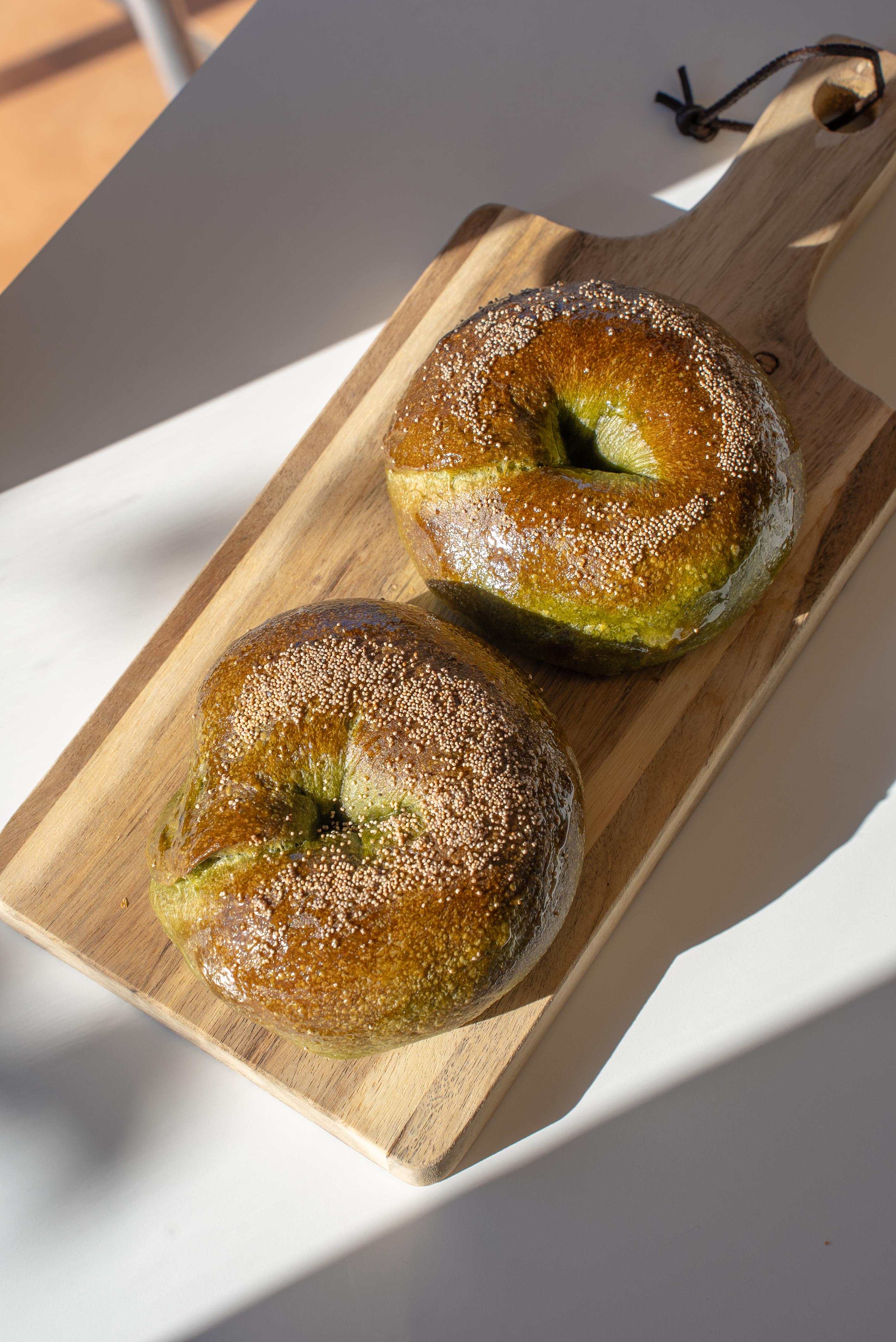 抹茶ベーグルに、望月さんの粒あん、求肥餅をつつみました。
